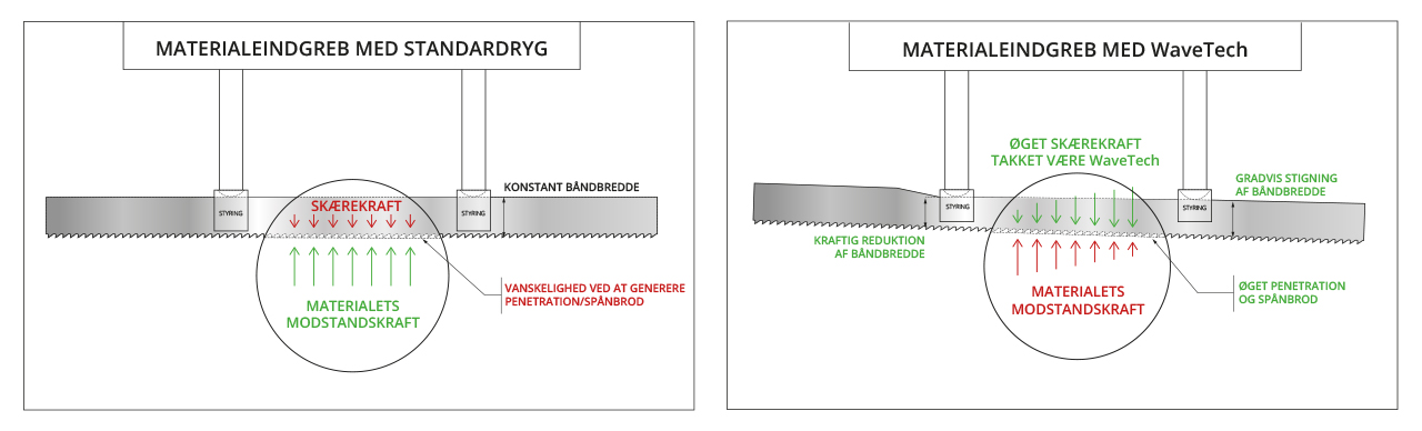 WaveTech® betyder, at klingens bagside formes, så den får en let, styret bølgebevægelse under drift. Bevægelsen bidrager til, at tandspidsen lettere kan penetrere hårde eller arbejdehærdede overflader, samtidig med at friktionen reduceres. En bedre spånbelastning opnås, hvilket mindsker varmeudviklingen og reducerer risikoen for stressrelaterede skader i klingekroppen.